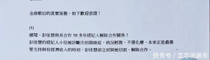 2月25号,“彭佳慧霸凌经纪人”的话题登上了热搜榜单。据传,彭佳慧的经纪人苏莹恬在与她合作十年后被诊断出患有癌症,因此彭佳慧决定与他断绝合作关系。彭佳慧毫不犹豫地终止了合作,并尖刻地说:既然你没有孩子,为何要赚那么多钱?